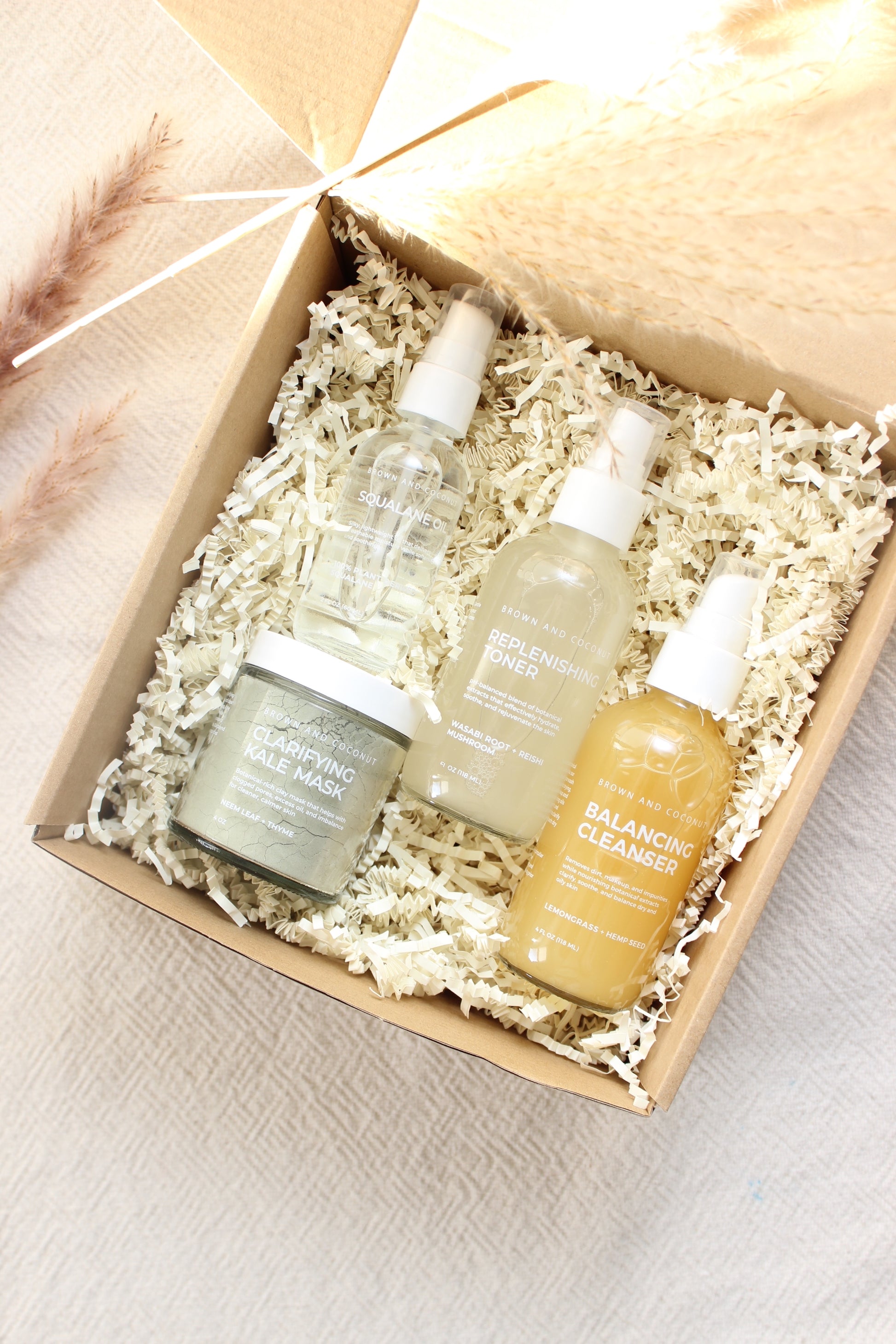 This set includes our Balancing Cleanser, Clarifying Kale Mask, Replenishing Toner, and Squalane Face Oil.